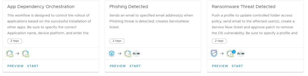 The one above that I find particularly appealing is how you can partner Carbon Black, WS1, and Service-Now to combat Ransomware Threats by locking down folder access, sending an email, and opening a ticket to that effect. As you can see, you can build a beautiful harmony across your enterprise provided you have made technological investments that mesh with their supported Workspace ONE Trust Network partners. Now, enjoy the demo on building automations:
